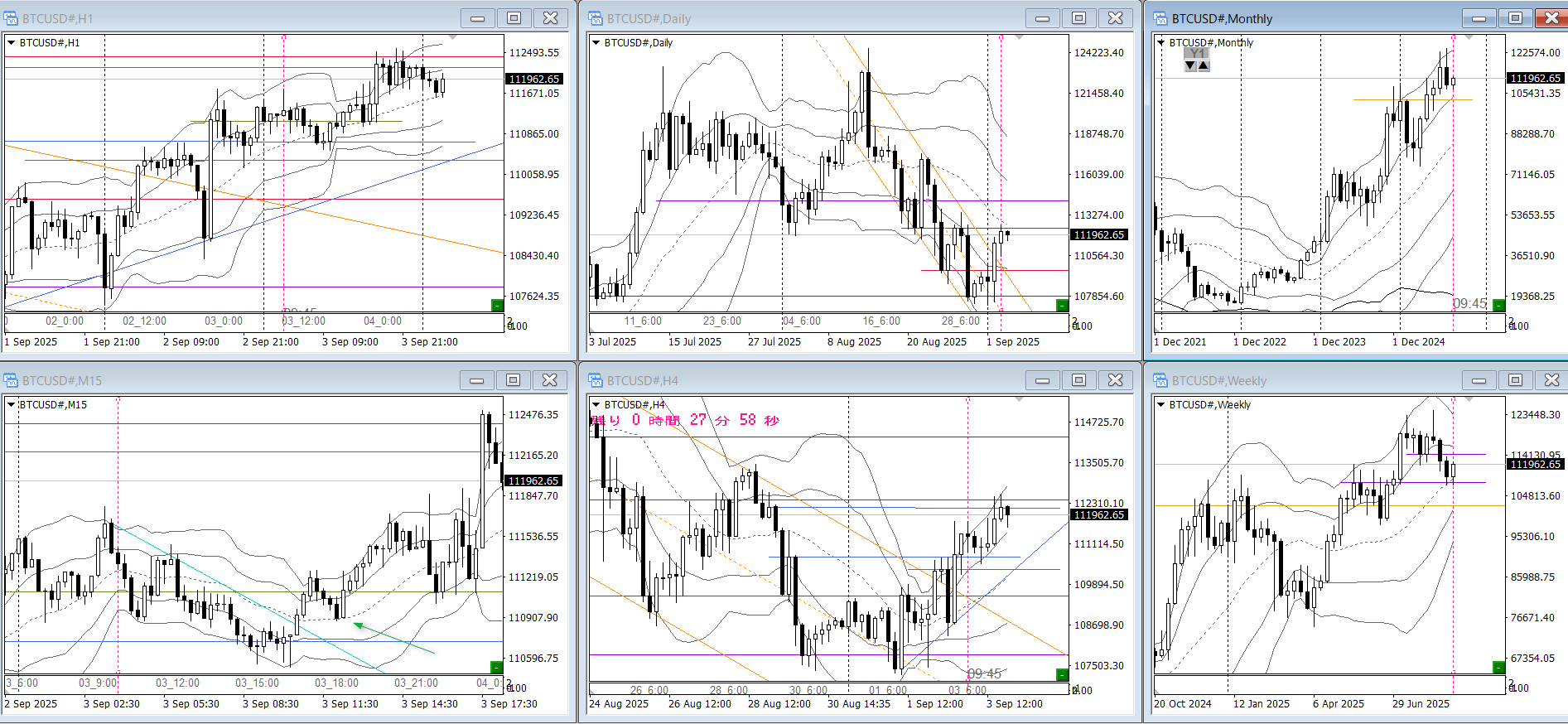 週足のダウ継続点割って来てるので、ポテンシャル的には月足ダウの流れに回帰して上限突破していく